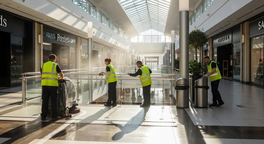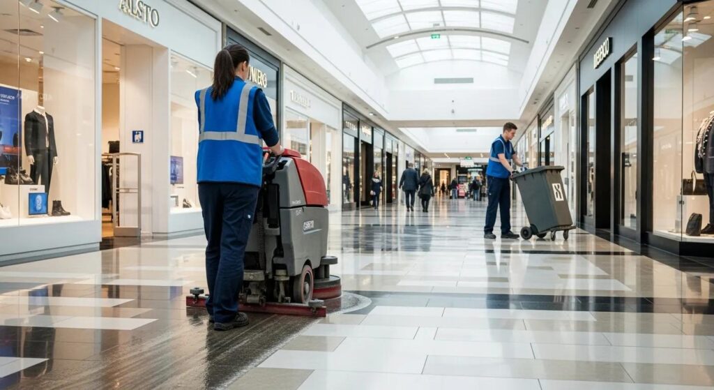 During trading hours, the focus is on maintaining cleanliness in high-traffic areas. This includes constant monitoring of food courts and bathrooms, promptly addressing spills, emptying bins, spot-mopping floors, and ensuring the centre’s overall presentation remains high. A visible team of daytime Shopping Centre Cleaners handles this.