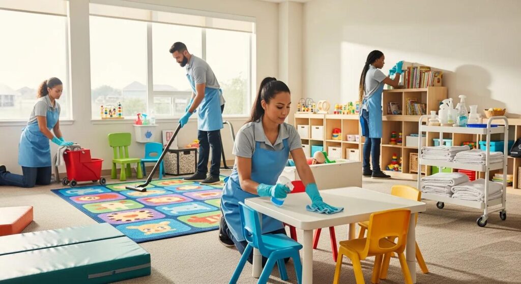 While educators perform spot cleaning throughout the day, a professional Childcare Centre Cleaner should visit daily, typically after hours. This ensures that all surfaces, floors, and bathrooms are deep-cleaned every single night, resetting hygiene levels for the next day. Periodic deep cleans (e.g., steam-cleaning carpets or high-window cleaning) can be scheduled monthly or quarterly.